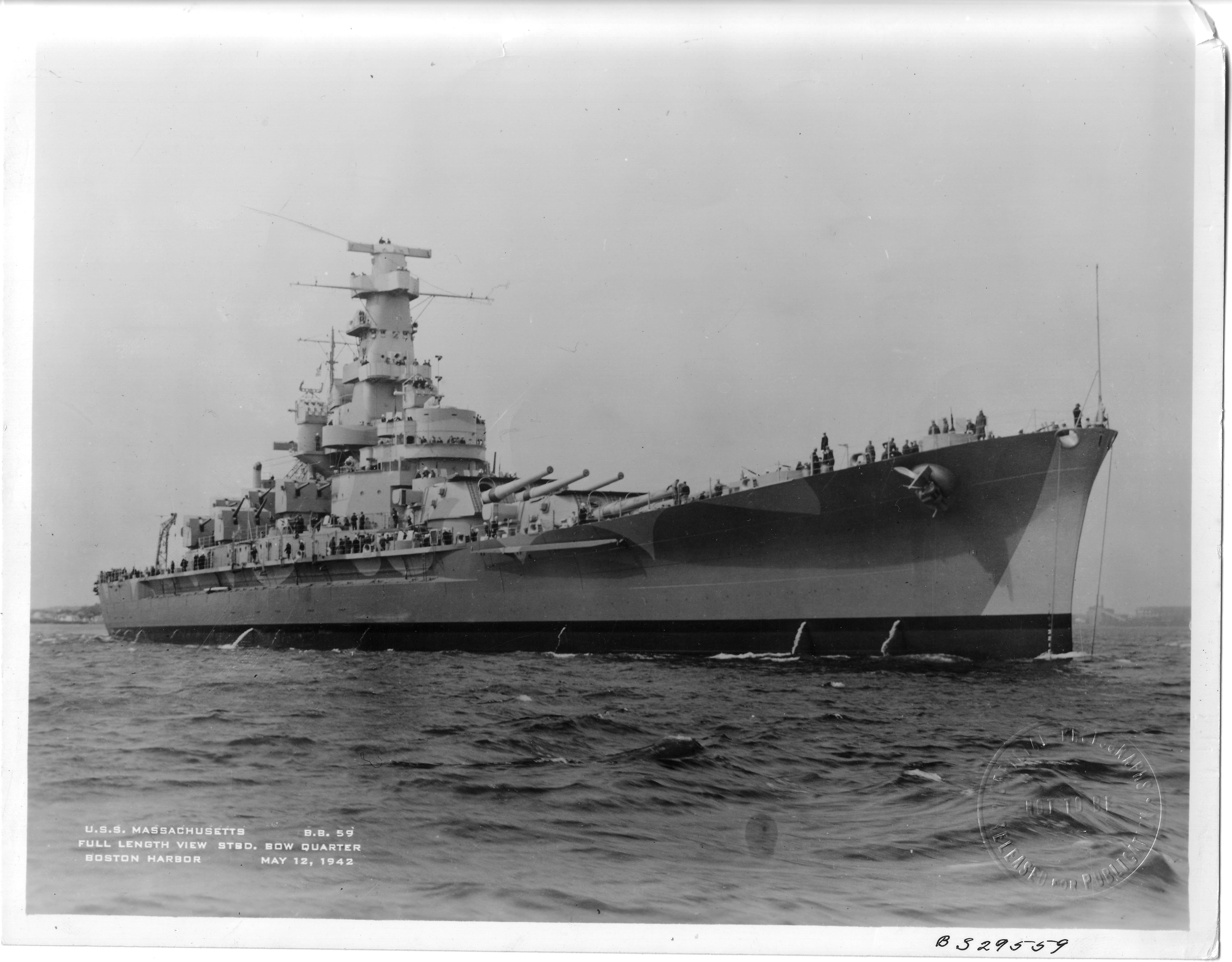 Boston Harbor is full of Massachusetts (BB-59) in this lengthy starboard bow quarter view on 12 May 1942 after being commissioned this day.