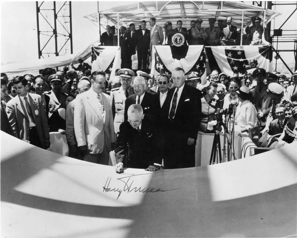 President Harry S. Truman authenticates the keel of the Nautilus (SSN-571) at her keel laying at the Electric Boat Co., Groton, Conn. on 14 June 1952.