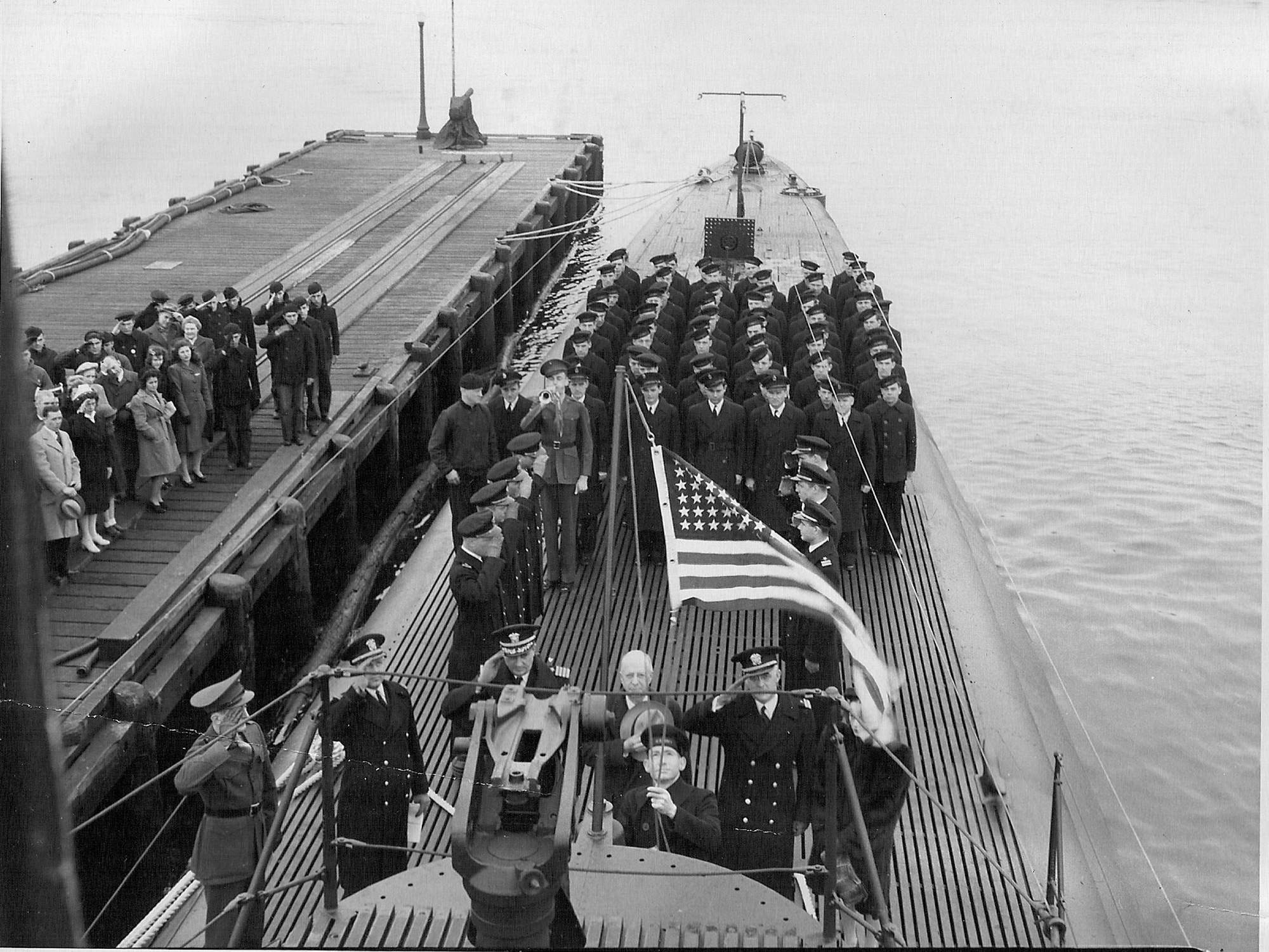 The national ensign is saluted by Cobia's (SS-245) crew on 29 March 1944 during her commissioning.